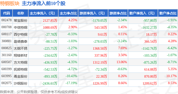 从资金流向上来看,当日特钢板块主力资金净流出1.08亿元,游资资金净流入5304.34万元,散户资金净流入5464.32万元。特钢板块个股资金流向见下表: