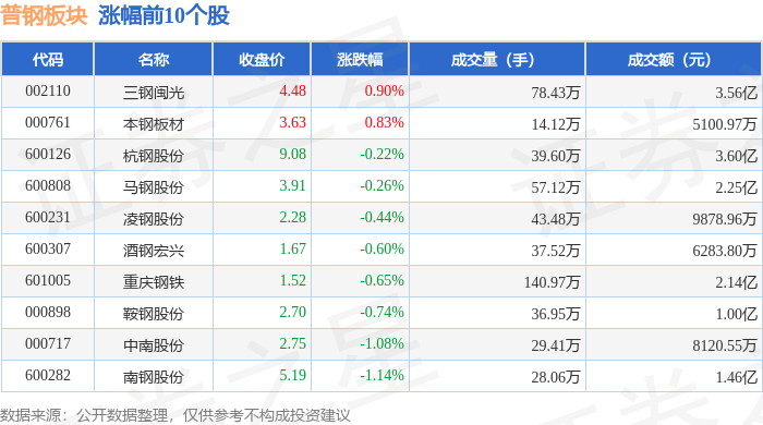 证券之星消息,10月28日普钢板块较上一交易日下跌1.81%,武进不锈领跌。当日上证指数报收于3988.22,下跌0.22%。深证成指报收于13430.1,下跌0.44%。普钢板块个股涨跌见下表: