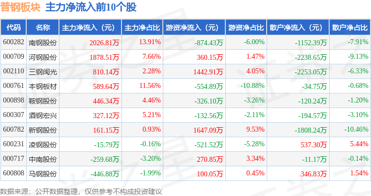 从资金流向上来看,当日普钢板块主力资金净流出9.22亿元,游资资金净流入2.54亿元,散户资金净流入6.68亿元。普钢板块个股资金流向见下表: