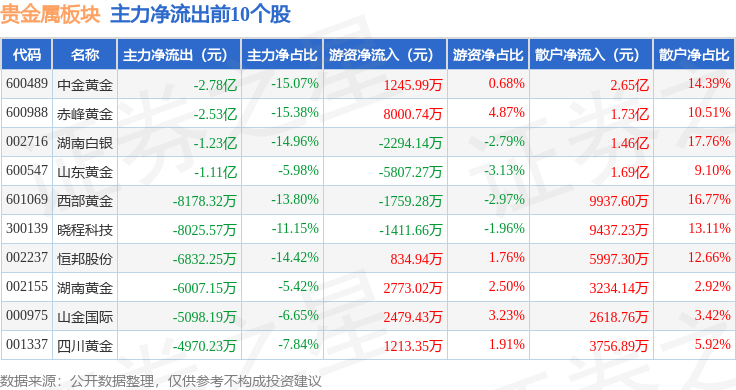 从资金流向上来看,当日贵金属板块主力资金净流出11.93亿元,游资资金净流入5047.12万元,散户资金净流入11.43亿元。贵金属板块个股资金流向见下表: