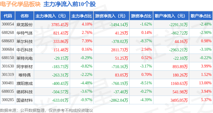 从资金流向上来看,当日电子化学品板块主力资金净流出14.46亿元,游资资金净流入1.94亿元,散户资金净流入12.53亿元。电子化学品板块个股资金流向见下表: