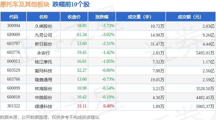 从资金流向上来看,当日摩托车及其他板块主力资金净流出1.51亿元,游资资金净流入8857.15万元,散户资金净流入6261.11万元。摩托车及其他板块个股资金流向见下表: