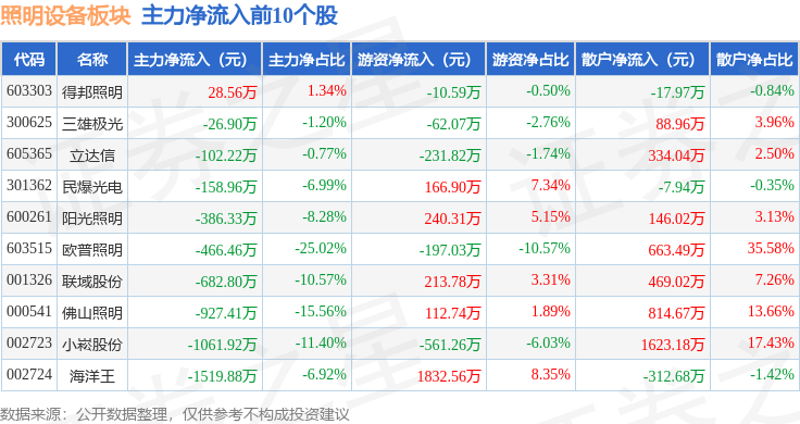 从资金流向上来看,当日照明设备板块主力资金净流出1.0亿元,游资资金净流入2985.01万元,散户资金净流入7045.48万元。照明设备板块个股资金流向见下表: