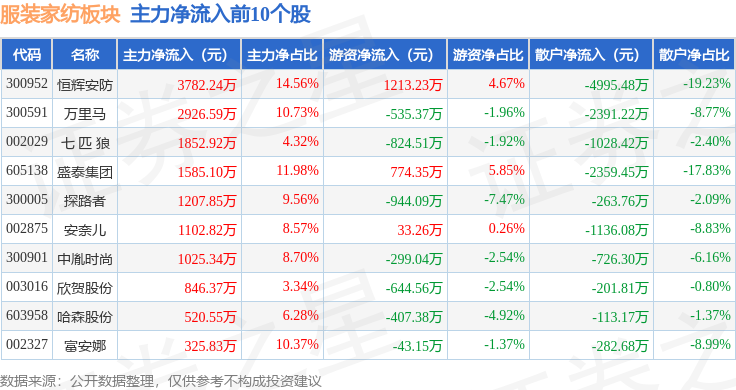 从资金流向上来看,当日服装家纺板块主力资金净流出1.47亿元,游资资金净流入2287.35万元,散户资金净流入1.25亿元。服装家纺板块个股资金流向见下表: