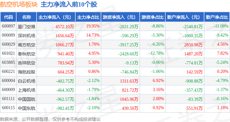 从资金流向上来看,当日航空机场板块主力资金净流入2209.64万元,游资资金净流出6489.8万元,散户资金净流入4280.16万元。航空机场板块个股资金流向见下表: