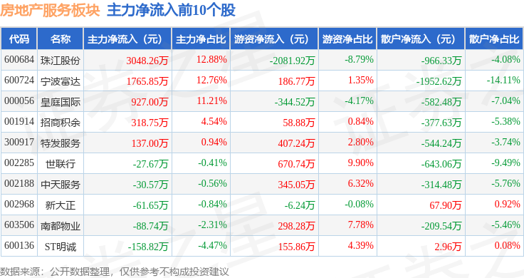 从资金流向上来看,当日房地产服务板块主力资金净流入2846.62万元,游资资金净流入386.23万元,散户资金净流出3232.85万元。房地产服务板块个股资金流向见下表: