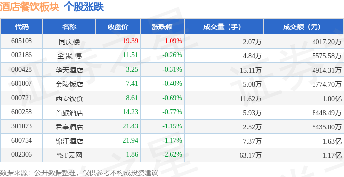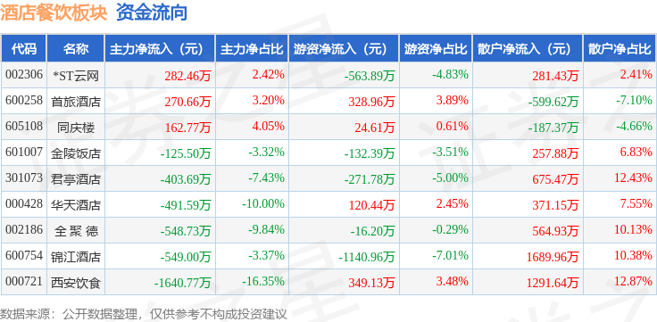 从资金流向上来看,当日酒店餐饮板块主力资金净流出3043.39万元,游资资金净流出1302.09万元,散户资金净流入4345.48万元。酒店餐饮板块个股资金流向见下表: