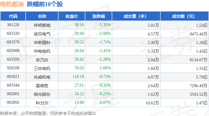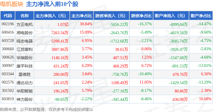 从资金流向上来看,当日电机板块主力资金净流出4.4亿元,游资资金净流入1.84亿元,散户资金净流入2.56亿元。电机板块个股资金流向见下表:
