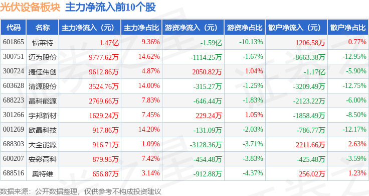 从资金流向上来看,当日光伏设备板块主力资金净流出13.22亿元,游资资金净流入3.08亿元,散户资金净流入10.15亿元。光伏设备板块个股资金流向见下表: