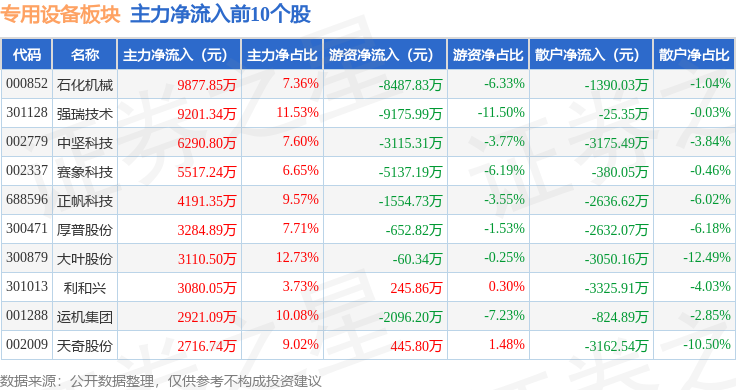 从资金流向上来看,当日专用设备板块主力资金净流出17.4亿元,游资资金净流入1.56亿元,散户资金净流入15.83亿元。专用设备板块个股资金流向见下表: