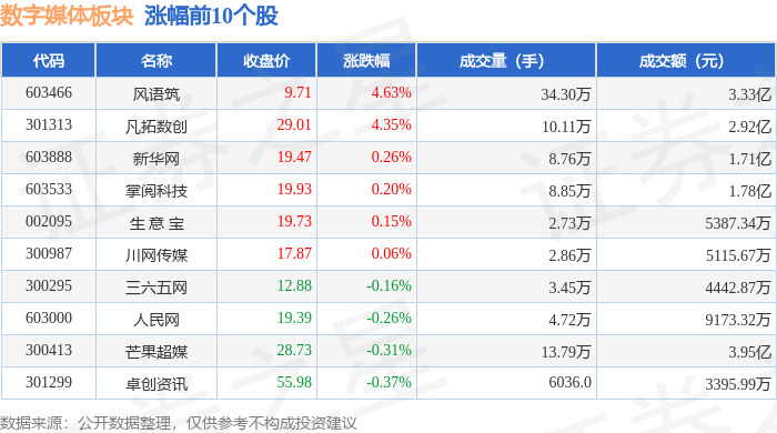 证券之星消息,10月28日数字媒体板块较上一交易日下跌0.18%,国脉文化领跌。当日上证指数报收于3988.22,下跌0.22%。深证成指报收于13430.1,下跌0.44%。数字媒体板块个股涨跌见下表: