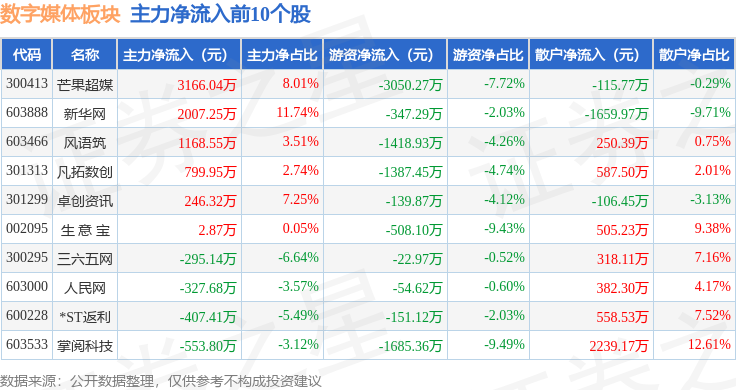 从资金流向上来看,当日数字媒体板块主力资金净流出438.69万元,游资资金净流出7286.02万元,散户资金净流入7724.7万元。数字媒体板块个股资金流向见下表: