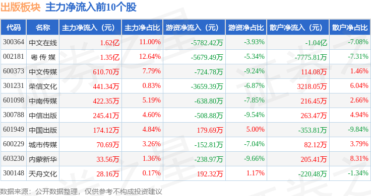 从资金流向上来看,当日出版板块主力资金净流入1.5亿元,游资资金净流出8476.29万元,散户资金净流出6513.04万元。出版板块个股资金流向见下表: