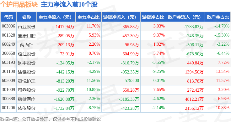 从资金流向上来看,当日个护用品板块主力资金净流出1.17亿元,游资资金净流入1270.44万元,散户资金净流入1.04亿元。个护用品板块个股资金流向见下表: