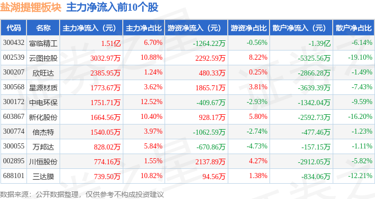 从资金流向上来看,当日盐湖提锂板块主力资金净流出18.41亿元,游资资金净流入3.83亿元,散户资金净流入14.58亿元。盐湖提锂板块个股资金流向见下表: