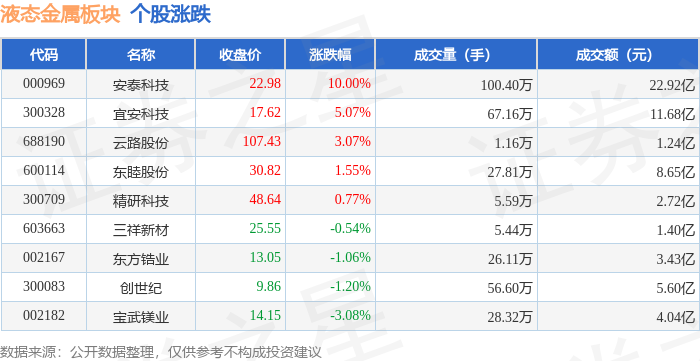 证券之星消息,10月28日液态金属板块较上一交易日上涨2.28%,安泰科技领涨。当日上证指数报收于3988.22,下跌0.22%。深证成指报收于13430.1,下跌0.44%。液态金属板块个股涨跌见下表:
