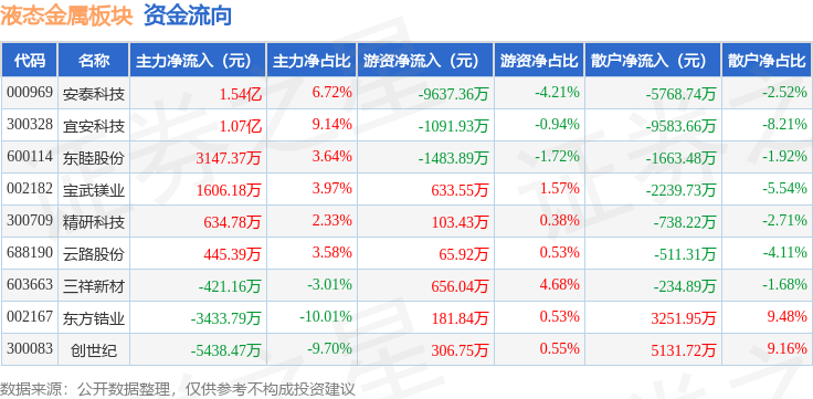 从资金流向上来看,当日液态金属板块主力资金净流入2.26亿元,游资资金净流出1.03亿元,散户资金净流出1.24亿元。液态金属板块个股资金流向见下表: