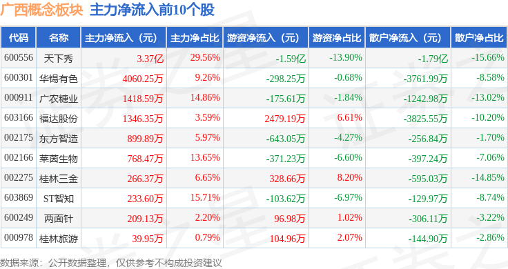 从资金流向上来看,当日广西概念板块主力资金净流出1766.87万元,游资资金净流出1144.42万元,散户资金净流入2911.28万元。广西概念板块个股资金流向见下表:
