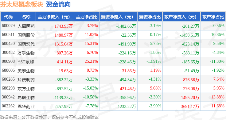 从资金流向上来看,当日芬太尼概念板块主力资金净流入1104.0万元,游资资金净流出4079.74万元,散户资金净流入2975.73万元。芬太尼概念板块个股资金流向见下表: