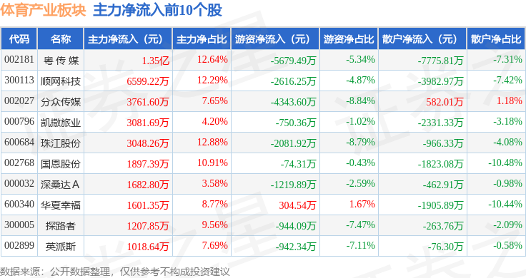 从资金流向上来看,当日体育产业板块主力资金净流入3273.21万元,游资资金净流出1.24亿元,散户资金净流入9162.8万元。体育产业板块个股资金流向见下表: