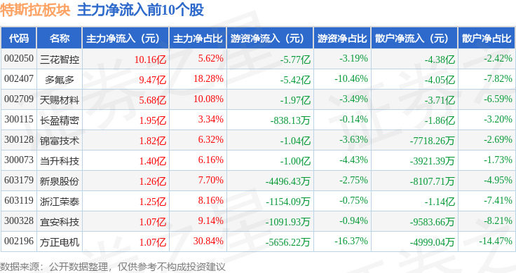 从资金流向上来看,当日特斯拉板块主力资金净流出33.74亿元,游资资金净流入2.77亿元,散户资金净流入30.97亿元。特斯拉板块个股资金流向见下表: