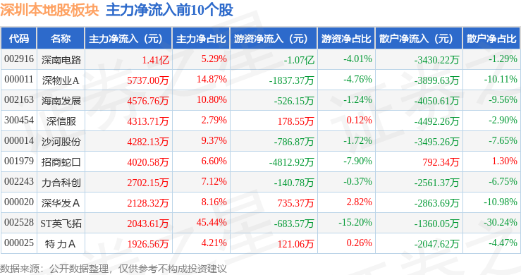 从资金流向上来看,当日深圳本地股板块主力资金净流出21.37亿元,游资资金净流入3.85亿元,散户资金净流入17.51亿元。深圳本地股板块个股资金流向见下表: