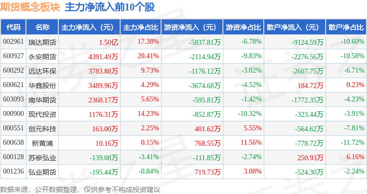 从资金流向上来看,当日期货概念板块主力资金净流出7.05亿元,游资资金净流入4.09亿元,散户资金净流入2.96亿元。期货概念板块个股资金流向见下表: