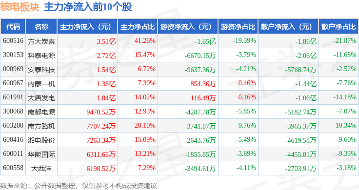 从资金流向上来看,当日核电板块主力资金净流出20.25亿元,游资资金净流出3.23亿元,散户资金净流入23.49亿元。核电板块个股资金流向见下表: