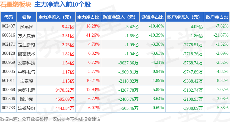 从资金流向上来看,当日石墨烯板块主力资金净流入13.83亿元,游资资金净流出8.26亿元,散户资金净流出5.57亿元。石墨烯板块个股资金流向见下表: