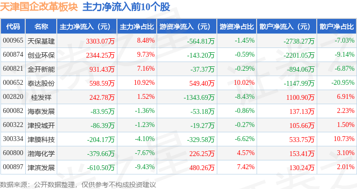 从资金流向上来看,当日天津国企改革板块主力资金净流出4383.97万元,游资资金净流出202.07万元,散户资金净流入4586.04万元。天津国企改革板块个股资金流向见下表: