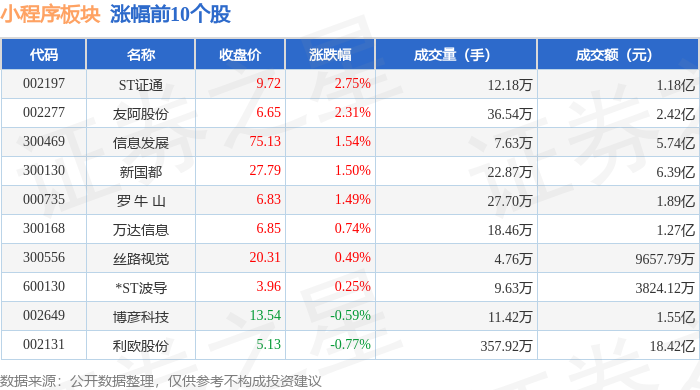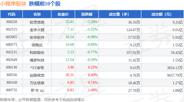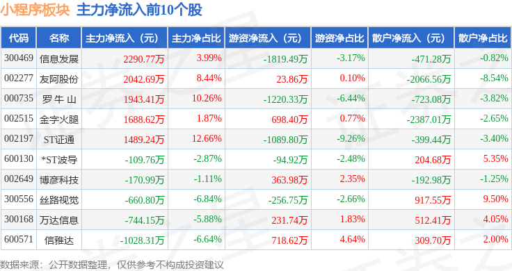 从资金流向上来看,当日小程序板块主力资金净流出2.75亿元,游资资金净流入1325.31万元,散户资金净流入2.62亿元。小程序板块个股资金流向见下表: