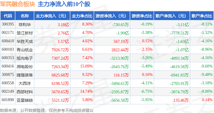 从资金流向上来看,当日军民融合板块主力资金净流出21.27亿元,游资资金净流入1.7亿元,散户资金净流入19.57亿元。军民融合板块个股资金流向见下表: