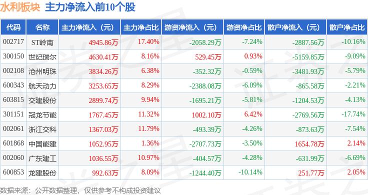从资金流向上来看,当日水利板块主力资金净流出14.98亿元,游资资金净流入1.06亿元,散户资金净流入13.93亿元。水利板块个股资金流向见下表: