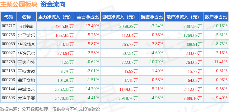 从资金流向上来看,当日主题公园板块主力资金净流入493.39万元,游资资金净流出5606.03万元,散户资金净流入5112.64万元。主题公园板块个股资金流向见下表: