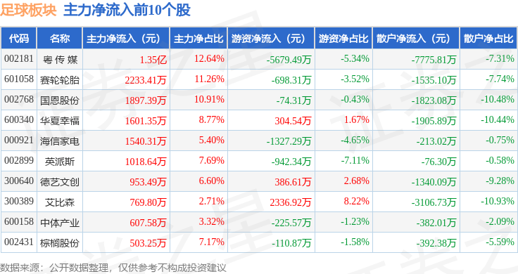 从资金流向上来看,当日足球板块主力资金净流入7056.97万元,游资资金净流入4342.1万元,散户资金净流出1.14亿元。足球板块个股资金流向见下表: