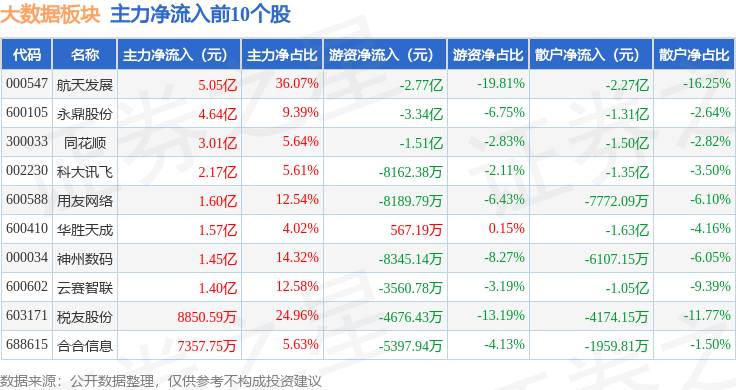 从资金流向上来看,当日大数据板块主力资金净流出38.92亿元,游资资金净流出2835.28万元,散户资金净流入39.2亿元。大数据板块个股资金流向见下表: