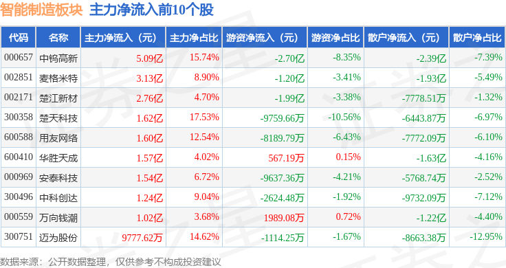 从资金流向上来看,当日智能制造板块主力资金净流出85.36亿元,游资资金净流入4.23亿元,散户资金净流入81.13亿元。智能制造板块个股资金流向见下表: