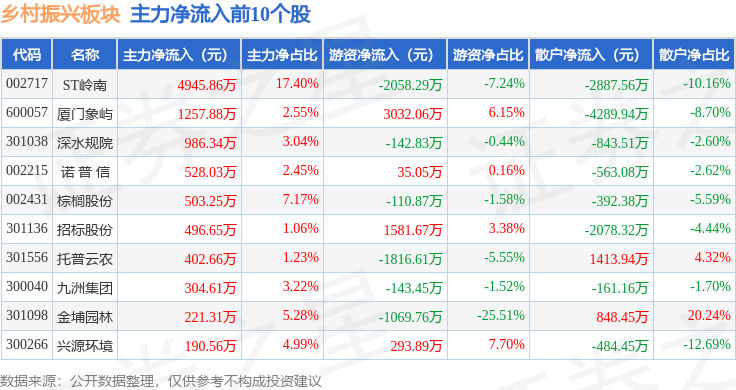 从资金流向上来看,当日乡村振兴板块主力资金净流出6.88亿元,游资资金净流入2.88亿元,散户资金净流入4.0亿元。乡村振兴板块个股资金流向见下表: