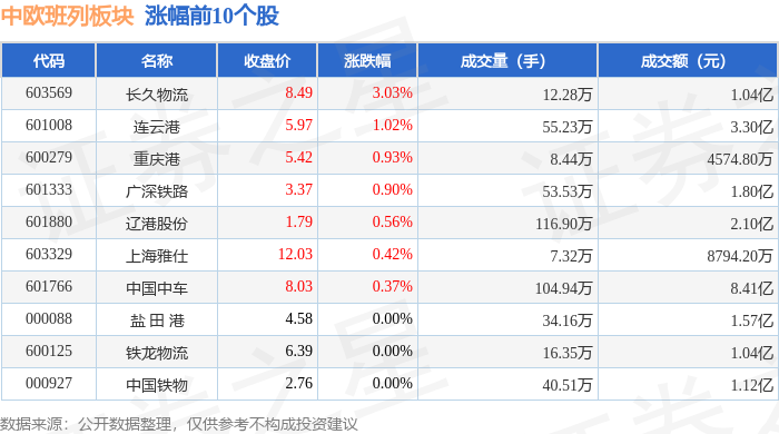 从资金流向上来看,当日中欧班列板块主力资金净流出2.0亿元,游资资金净流入9239.94万元,散户资金净流入1.08亿元。中欧班列板块个股资金流向见下表: