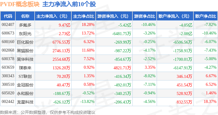 从资金流向上来看,当日PVDF概念板块主力资金净流入11.57亿元,游资资金净流出6.27亿元,散户资金净流出5.3亿元。PVDF概念板块个股资金流向见下表: