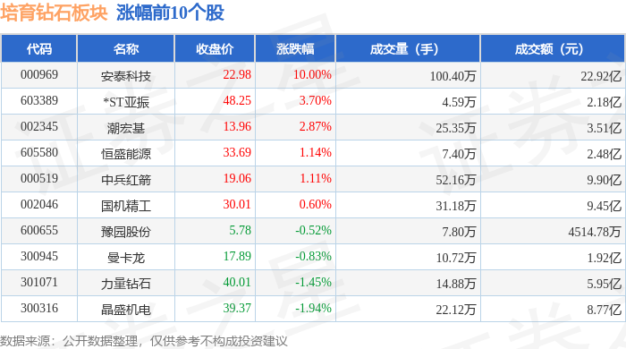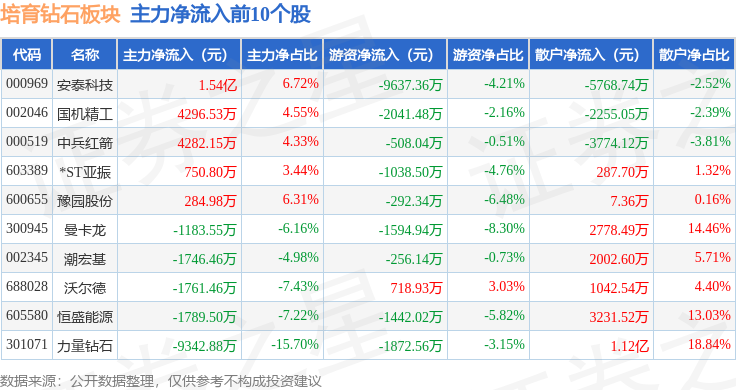 从资金流向上来看,当日培育钻石板块主力资金净流出3.36亿元,游资资金净流出1.59亿元,散户资金净流入4.95亿元。培育钻石板块个股资金流向见下表: