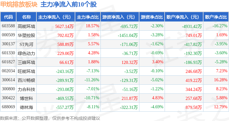 从资金流向上来看,当日甲烷排放板块主力资金净流出6376.79万元,游资资金净流入2396.62万元,散户资金净流入3980.17万元。甲烷排放板块个股资金流向见下表: