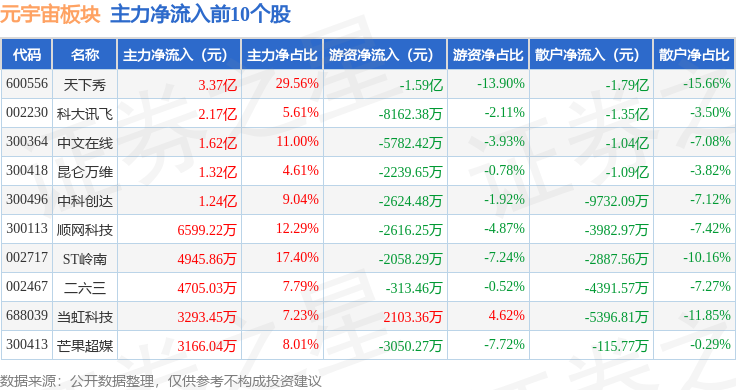 从资金流向上来看,当日元宇宙板块主力资金净流出17.38亿元,游资资金净流出5.02亿元,散户资金净流入22.4亿元。元宇宙板块个股资金流向见下表: