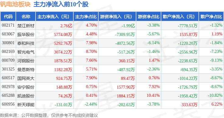 从资金流向上来看,当日钒电池板块主力资金净流出2.93亿元,游资资金净流出1.47亿元,散户资金净流入4.4亿元。钒电池板块个股资金流向见下表: