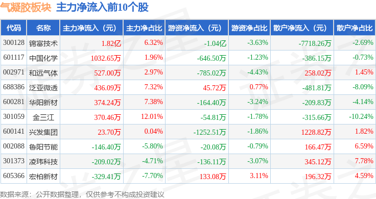 从资金流向上来看,当日气凝胶板块主力资金净流出9528.93万元,游资资金净流出1.75亿元,散户资金净流入2.7亿元。气凝胶板块个股资金流向见下表: