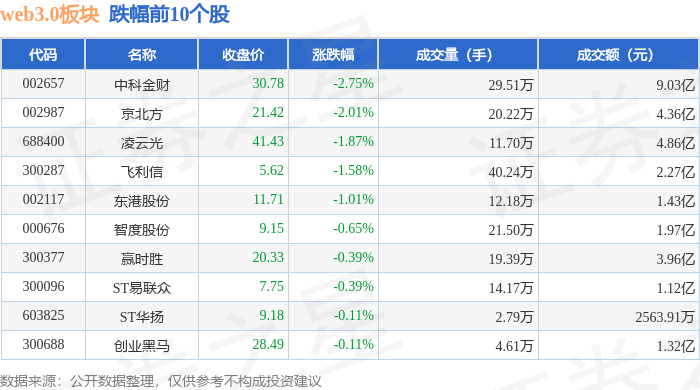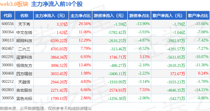 从资金流向上来看,当日web3.0板块主力资金净流入5.15亿元,游资资金净流出2.45亿元,散户资金净流出2.7亿元。web3.0板块个股资金流向见下表: