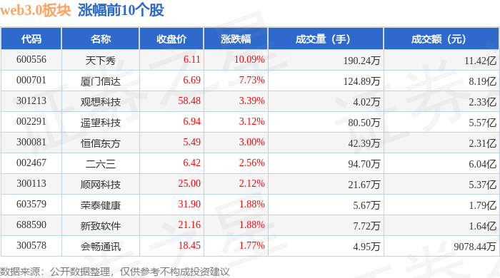 证券之星消息,10月28日web3.0板块较上一交易日上涨0.81%,天下秀领涨。当日上证指数报收于3988.22,下跌0.22%。深证成指报收于13430.1,下跌0.44%。web3.0板块个股涨跌见下表: