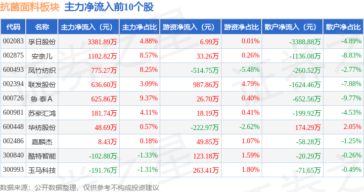 从资金流向上来看,当日抗菌面料板块主力资金净流出2.04亿元,游资资金净流出117.24万元,散户资金净流入2.06亿元。抗菌面料板块个股资金流向见下表: