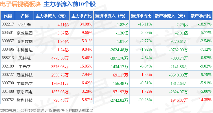 从资金流向上来看,当日电子后视镜板块主力资金净流出6.53亿元,游资资金净流入5.64亿元,散户资金净流入8934.41万元。电子后视镜板块个股资金流向见下表: