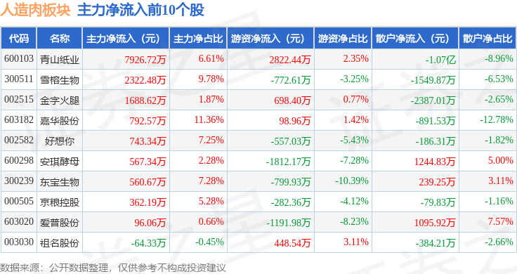 从资金流向上来看,当日人造肉板块主力资金净流出3.38亿元,游资资金净流入8972.18万元,散户资金净流入2.48亿元。人造肉板块个股资金流向见下表:
